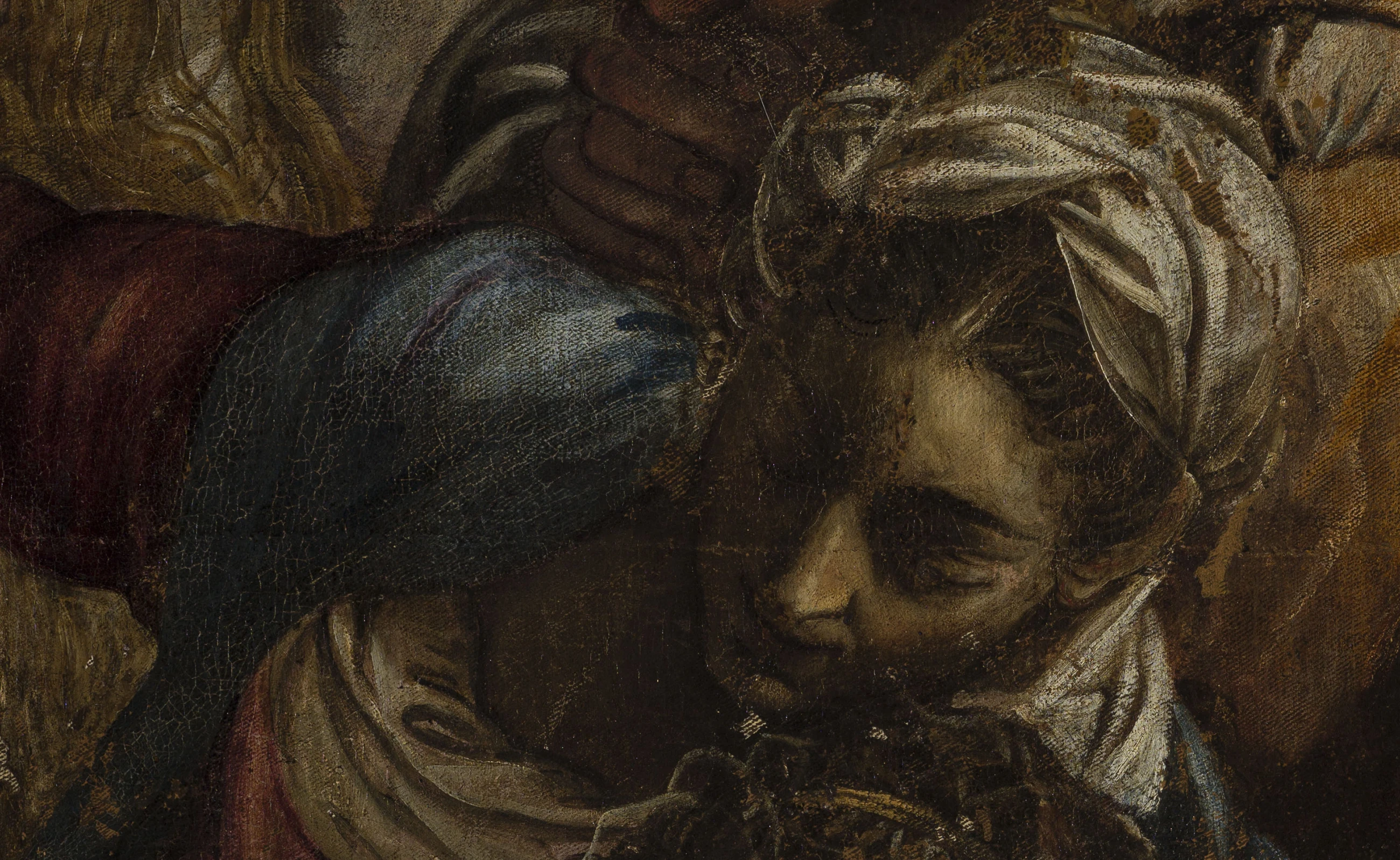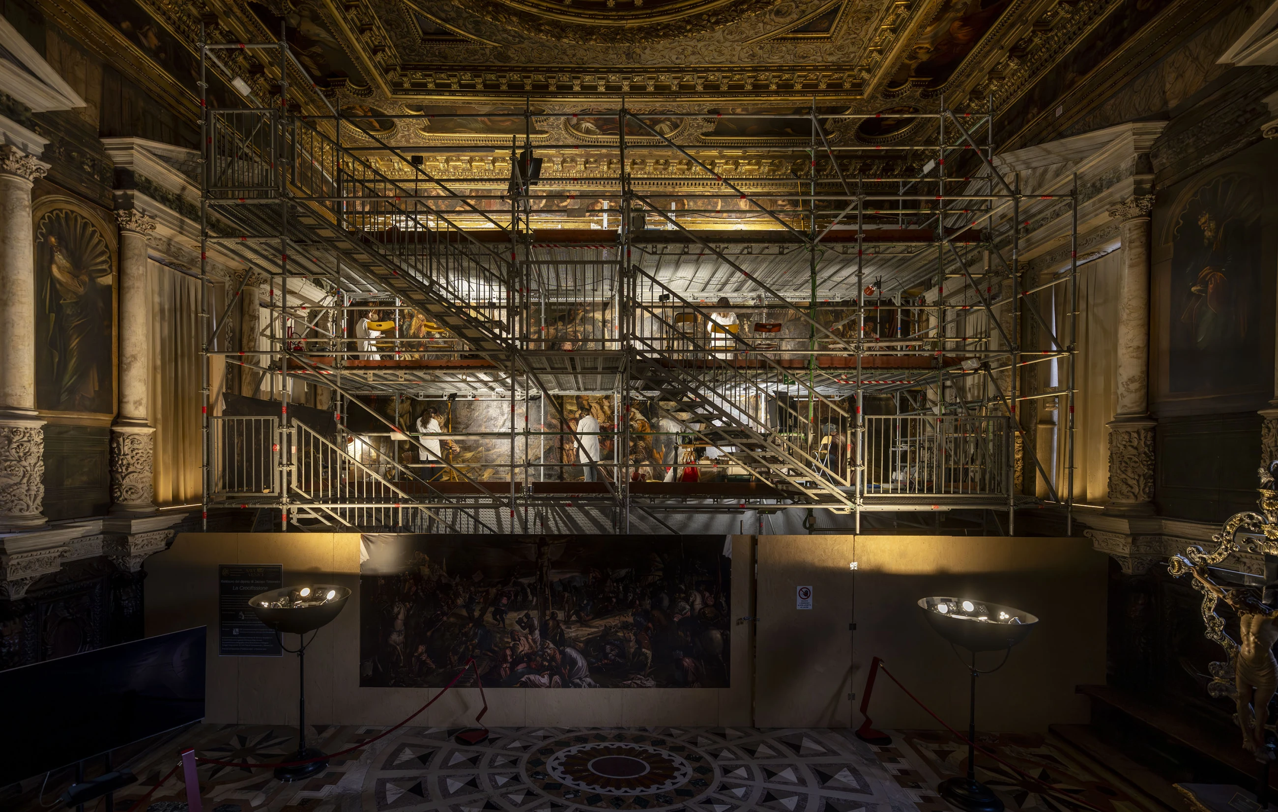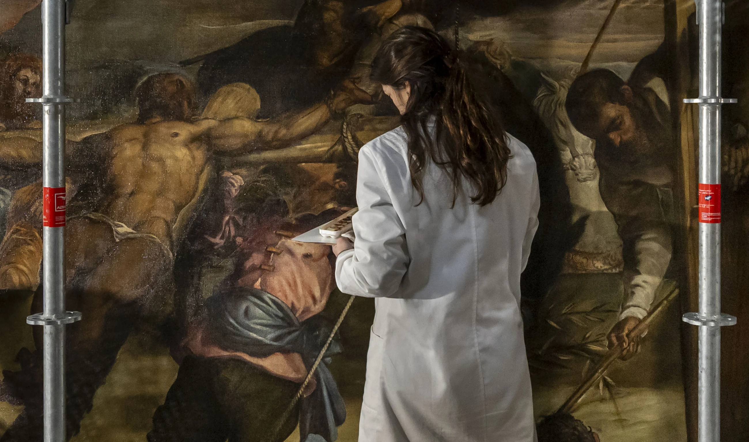 The conservation of Tintoretto’s colossal canvas began in spring 2022 with the installation of a scaffolding structure rising 21 feet high and 40 feet wide. Divided into three levels, it gave CBC conservators full access to every inch of the painting. The towering worksite was designed so that visitors could continue to admire the masterpiece from below, while a video by Giovanni Pellegrini of Ginko Film documented the conservation and shared its progress with the public.