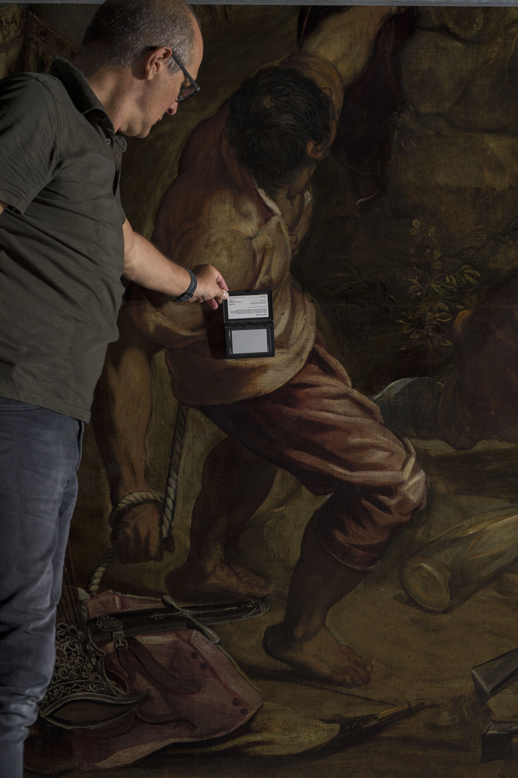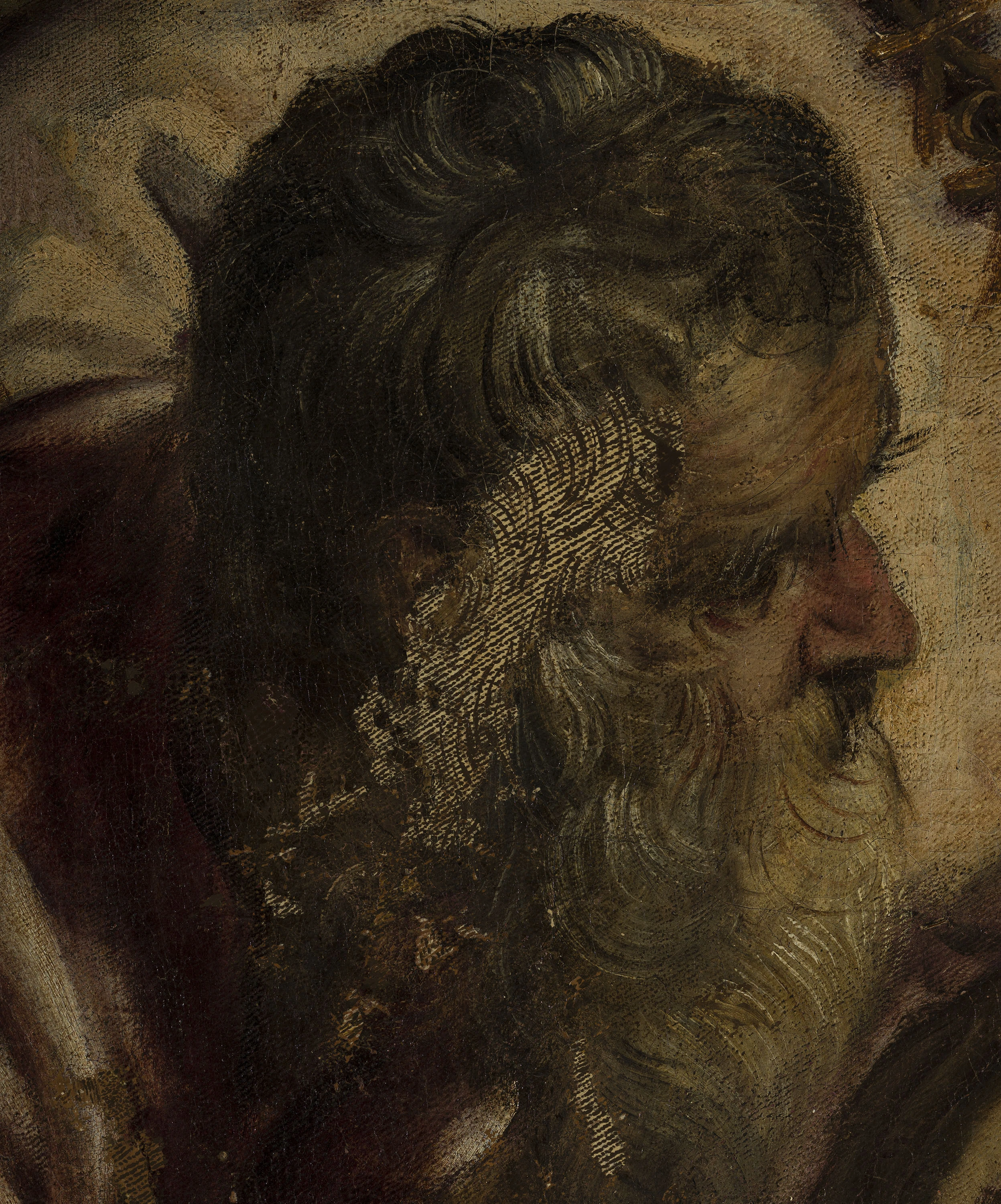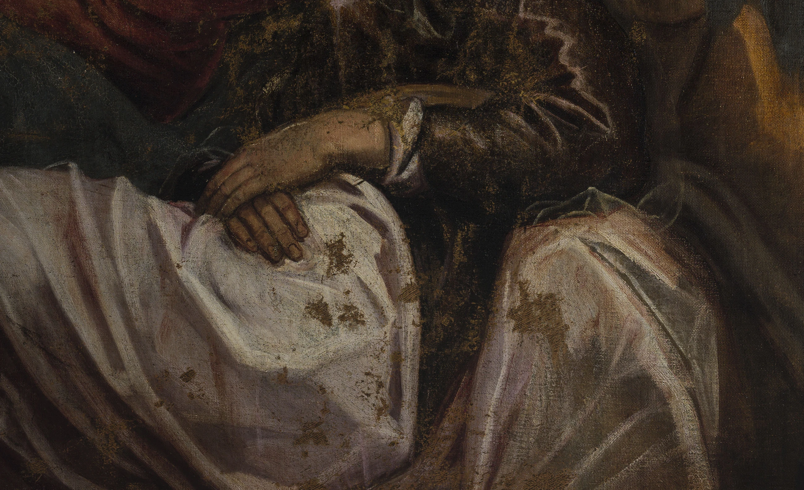 The conservation of Tintoretto’s colossal canvas began in spring 2022 with the installation of a scaffolding structure rising 21 feet high and 40 feet wide. Divided into three levels, it gave CBC conservators full access to every inch of the painting. The towering worksite was designed so that visitors could continue to admire the masterpiece from below, while a video by Giovanni Pellegrini of Ginko Film documented the conservation and shared its progress with the public.