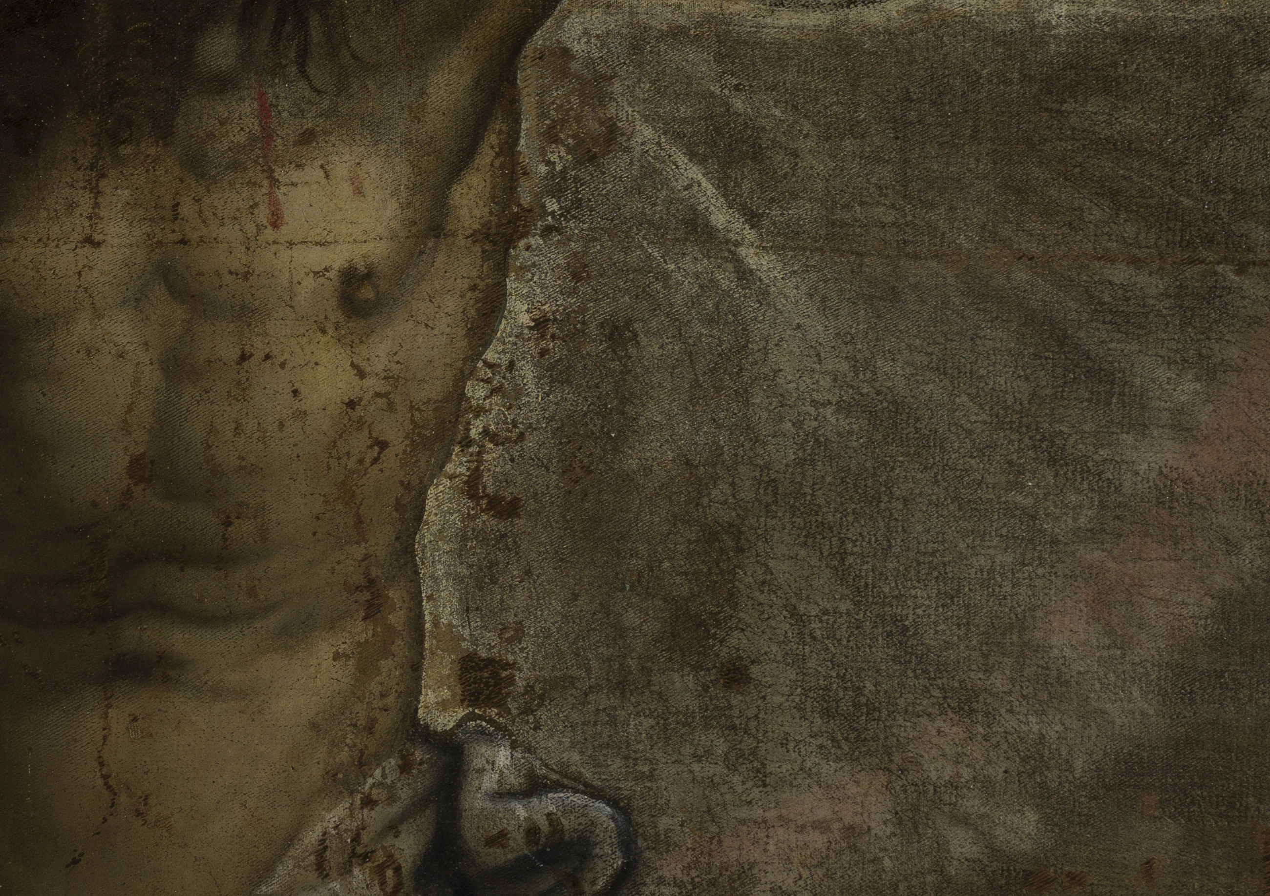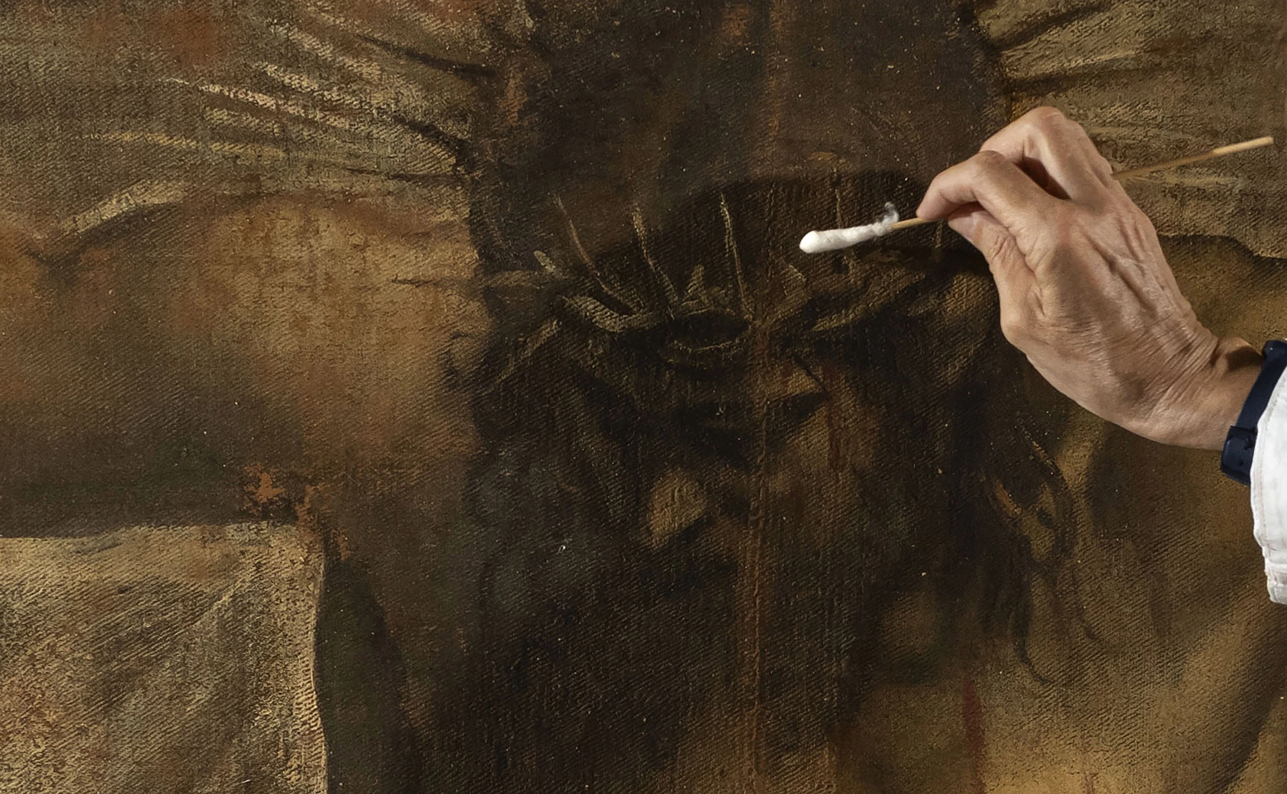 In early 2023, the S.T. Art-Test firm conducted a non-invasive diagnostic campaign on the painting, using ultraviolet and infrared (IR) photography to identify areas of damage and deterioration. Guided by these findings, conservation treatment began in spring 2023 to address multiple condition issues. CBC conservators faced numerous challenges: removing layers of yellowed varnish, glue residues, compacted dust, and discolored retouching left by earlier interventions. Only after this meticulous cleaning could they reintegrate areas of paint loss and abrasion—a careful process that concluded with the application of a protective final varnish. The team also carried out treatment on the painted frieze above the Crucifixion, ensuring the entire ensemble was restored to coherence.